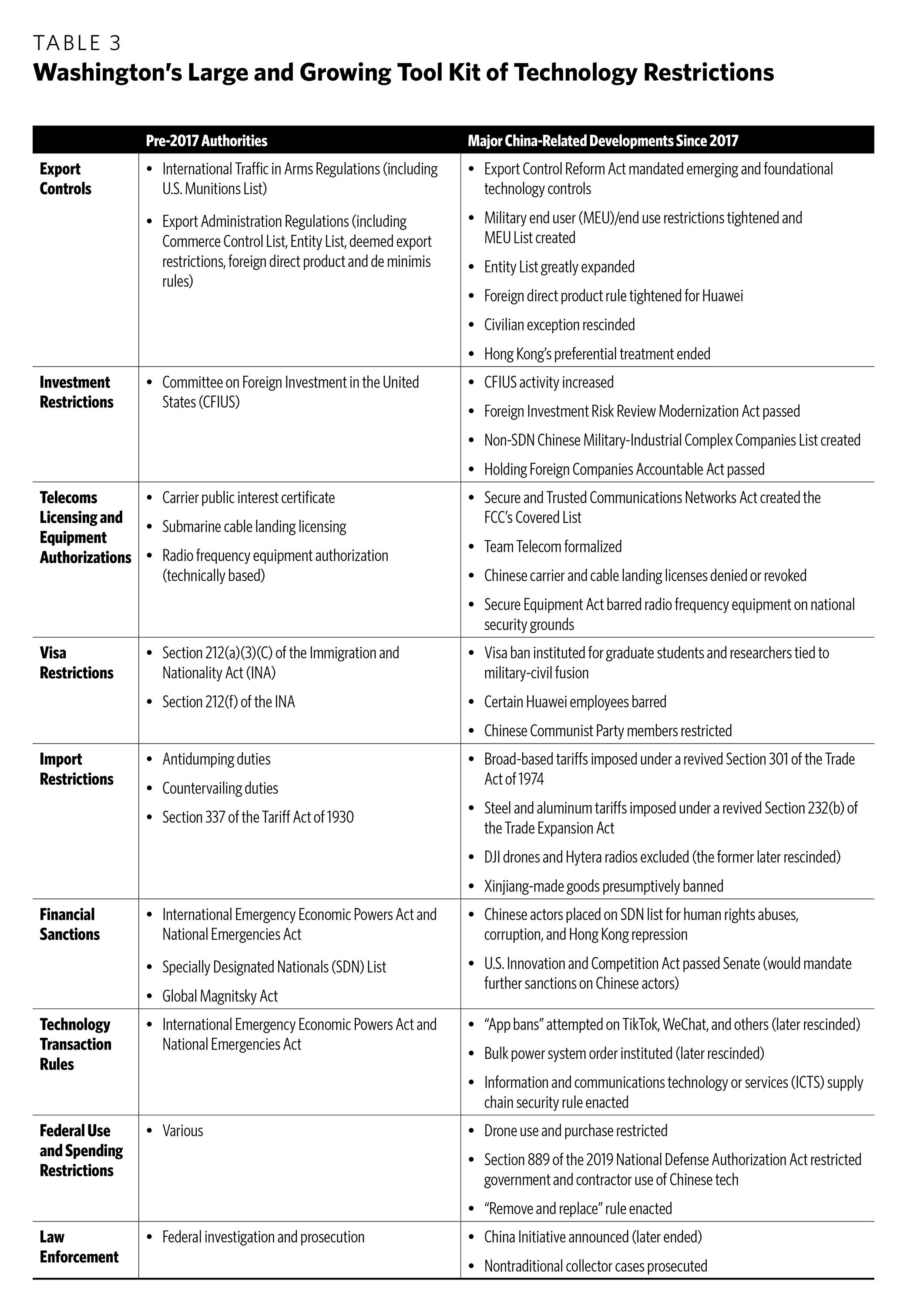 There are many kinds of defensive tools, and U.S. policymakers must have a firm grasp of their differences (see Table 3). Defensive tools are often described generically as “sanctions” or “blacklists,” but this conflates distinct legal authorities with a range of effects and implementing agencies. For example, SenseTime and Hytera are among the Chinese tech firms most targeted by U.S. controls, yet the restrictions imposed on each company do not overlap at all. Huawei, meanwhile, suffers from nearly all of the controls placed on both SenseTime and Hytera, plus others that are completely unique (see Table 4 at the end of the chapter).