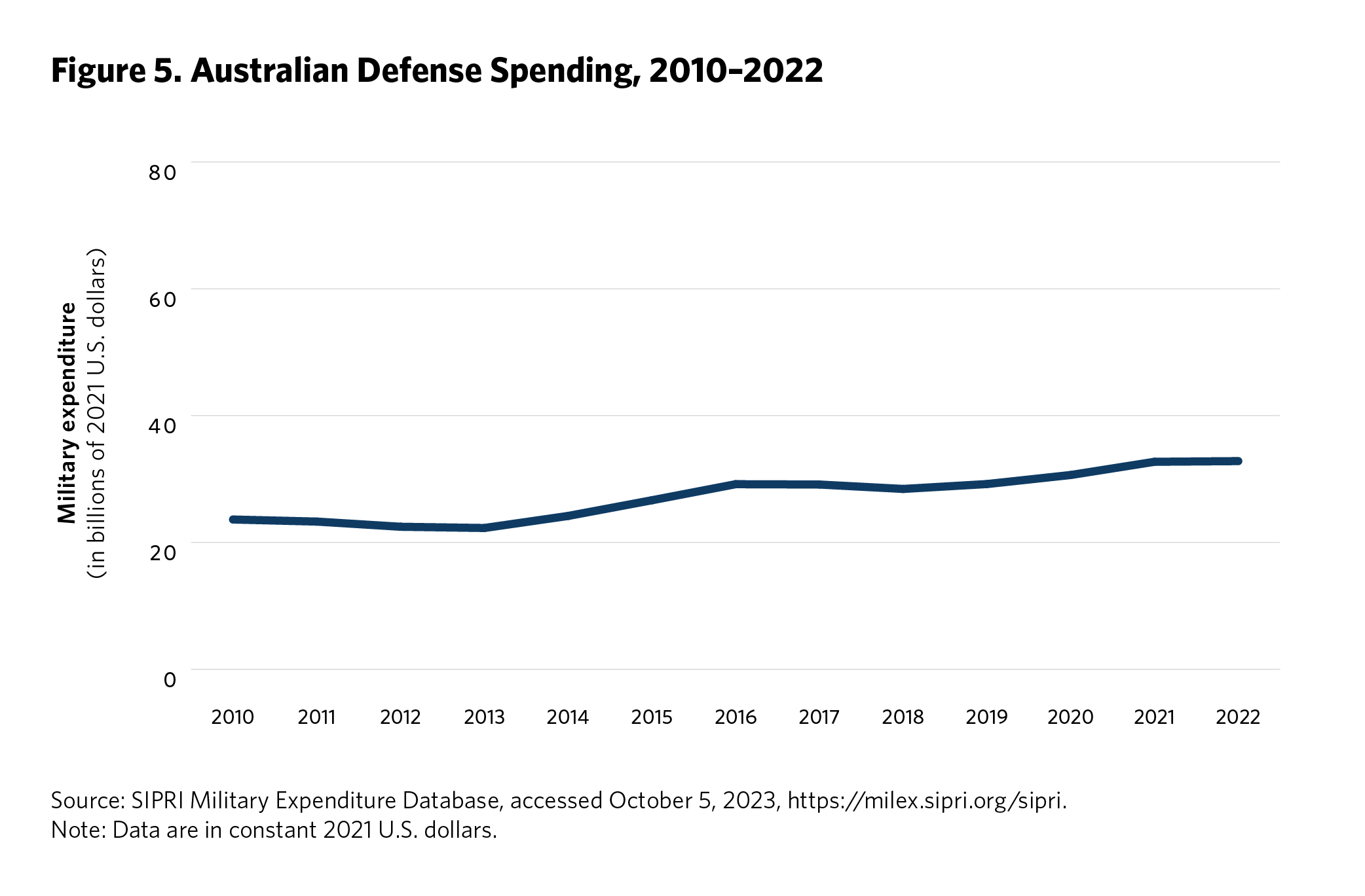 Australia has not traditionally sought or maintained long-range precision strike missile capabilities, but this has begun to change. Intensifying threat perceptions concerning China have been a primary driver of greater Australian interest in procuring advanced missile capabilities as part of a broader strategic adjustment in the country’s defense policy toward the twin objectives of assuring territorial defense while maintaining a power projection capability. The shifting approach to defense policymaking in Canberra is best seen in the changes that resulted between the country’s 2016 Defence White Paper73 and its 2020 Defence Strategic Update,74 the latter of which recognized a growing “risk of state-on-state conflict” and articulated a need for Australia to pursue a force capable of “[projecting] military power to shape our environment, deter actions against [Australian] interests and, when required, respond with effective military force.” These aspirations were further refined in Australia’s 2023 Defence Strategic Review.75 While Australian defense spending over the last decade has remained within 1.7 and 2.0 percent of gross domestic product (GDP), it has grown in absolute terms (see figure 5).76