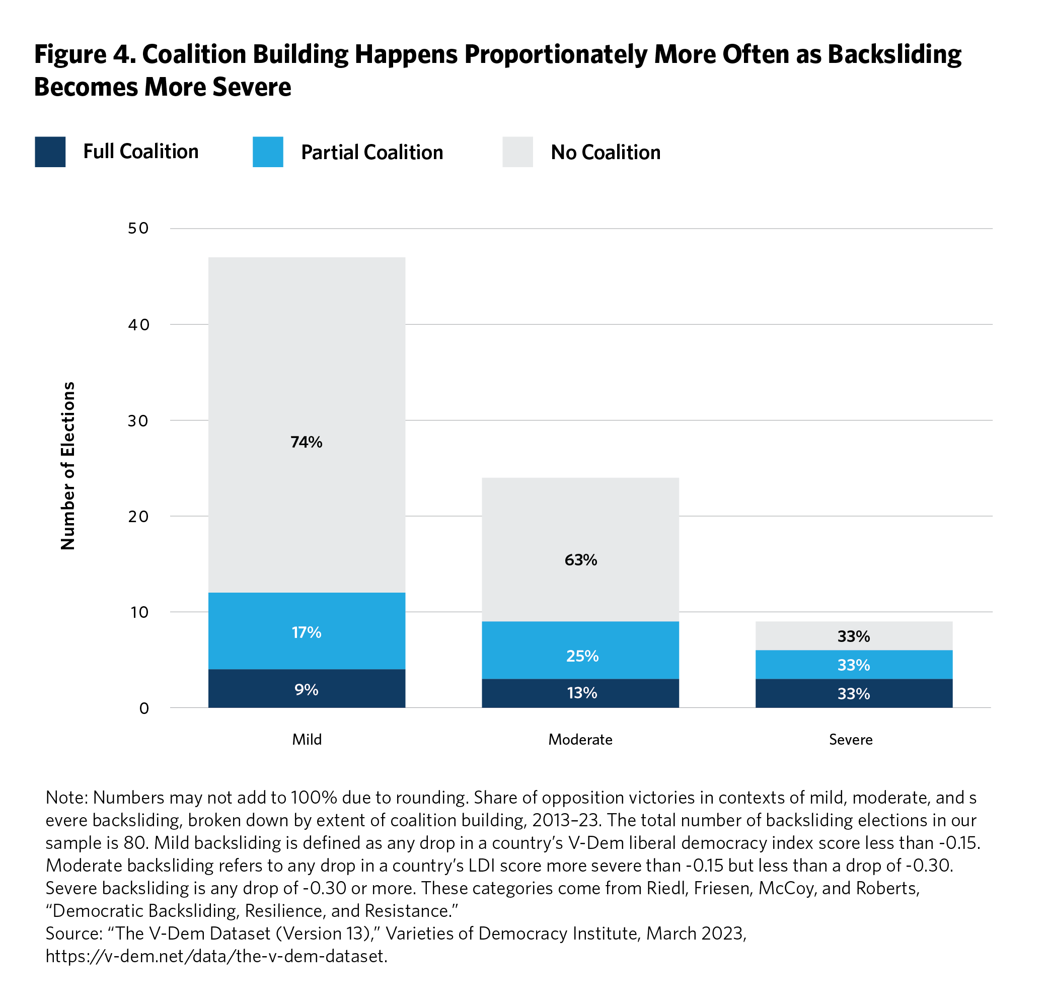 Figure 4 shows that in the past ten years, an opposition formed a full coalition in one-third of elections in countries with severe backsliding. In another third, an opposition formed a partial coalition (although as seen in Figure 1, none won). Meanwhile, among elections in countries with mild backsliding, only about one in ten oppositions formed a full coalition.
