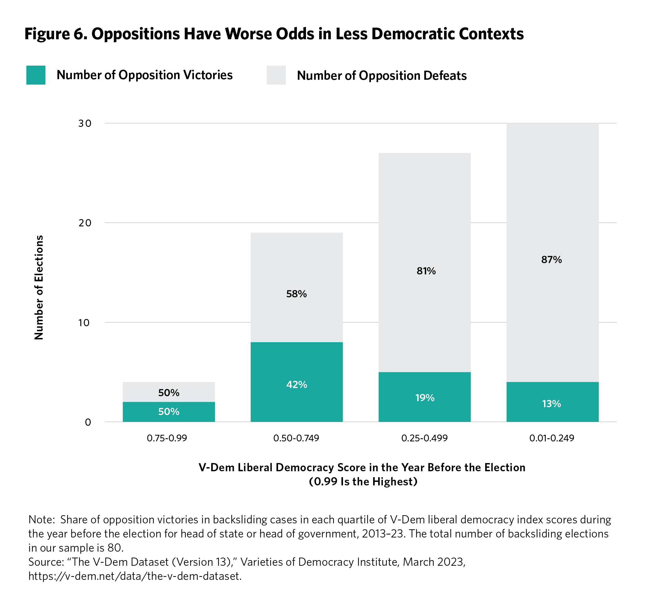 Likewise, oppositions can still win even in undemocratic contexts. Figure 6 shows that when the backsliding country was still above a V-Dem LDI score of 0.75, indicating a relatively strong liberal democracy, the odds were unsurprisingly 50–50 for an opposition to defeat the incumbent. Those odds fell marginally in contexts where the country’s LDI score was between 0.74 and 0.50, indicating a democracy with some deficits. Once the country fell below the 0.50 mark, often indicating a slide toward electoral authoritarianism, the odds of an opposition victory fell precipitously by more than half. But even in more clearly autocratic contexts (the bottom quartile of the LDI score), oppositions won 13 percent of the time.