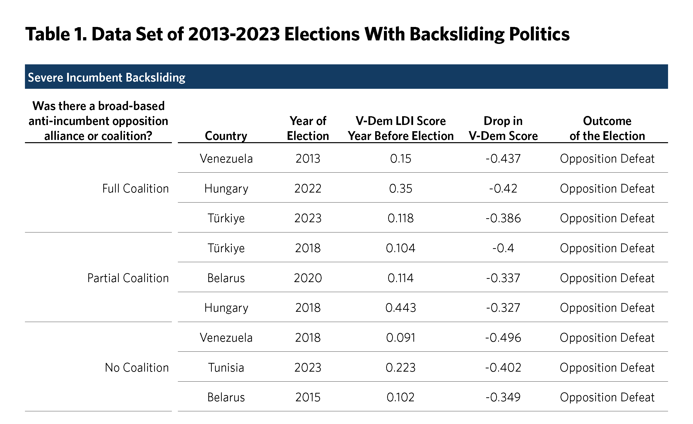 We considered a coalition strategy to be “partial” in cases where the opposition took steps to build an unusual electoral coalition for the purpose of ousting the backsliding incumbent, but it only partially succeeded. In these instances, generally the groundwork was laid for a coalition, but it did not attract a significantly broad group of partners, or multiple coalitions were formed and did not consolidate under one big tent.